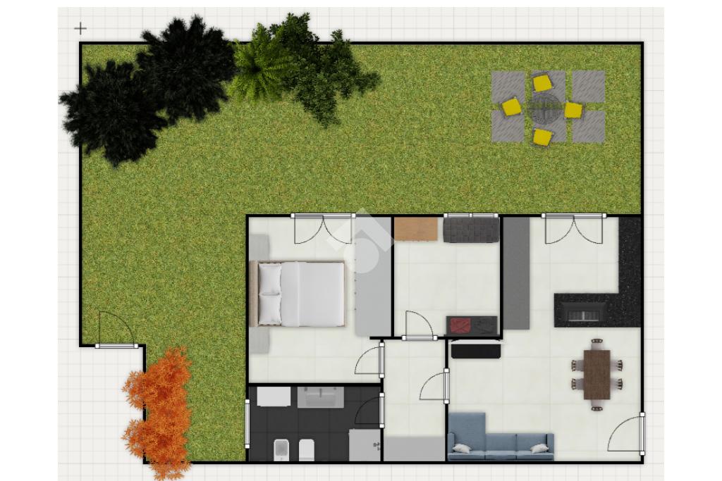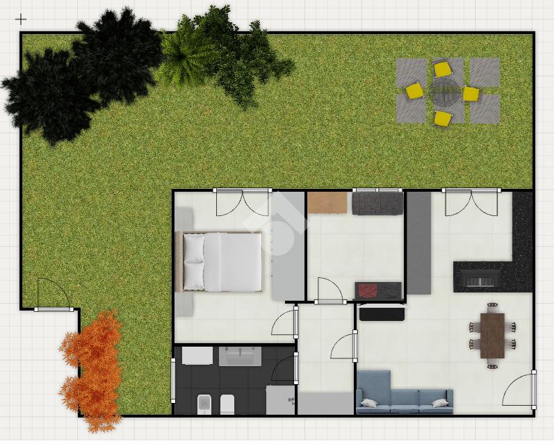 ingresso su soggiorno con cucina a vista, con accesso diretto al giardino;disimpegno con comodo angolo ripostiglio;camera matrimoniale con accesso diretto al giardino ;bagno finestrato;cameretta/studio, perfetta come spazio smart working o stanza ospiti.